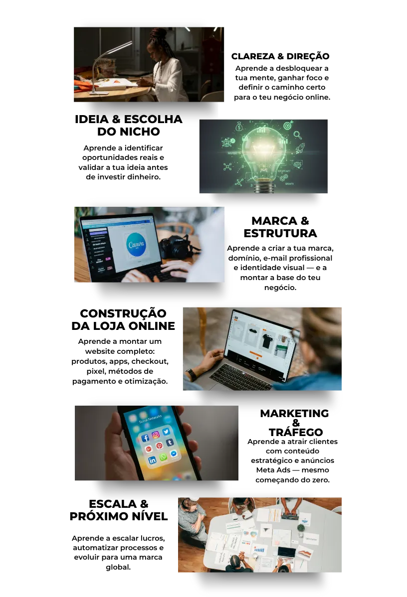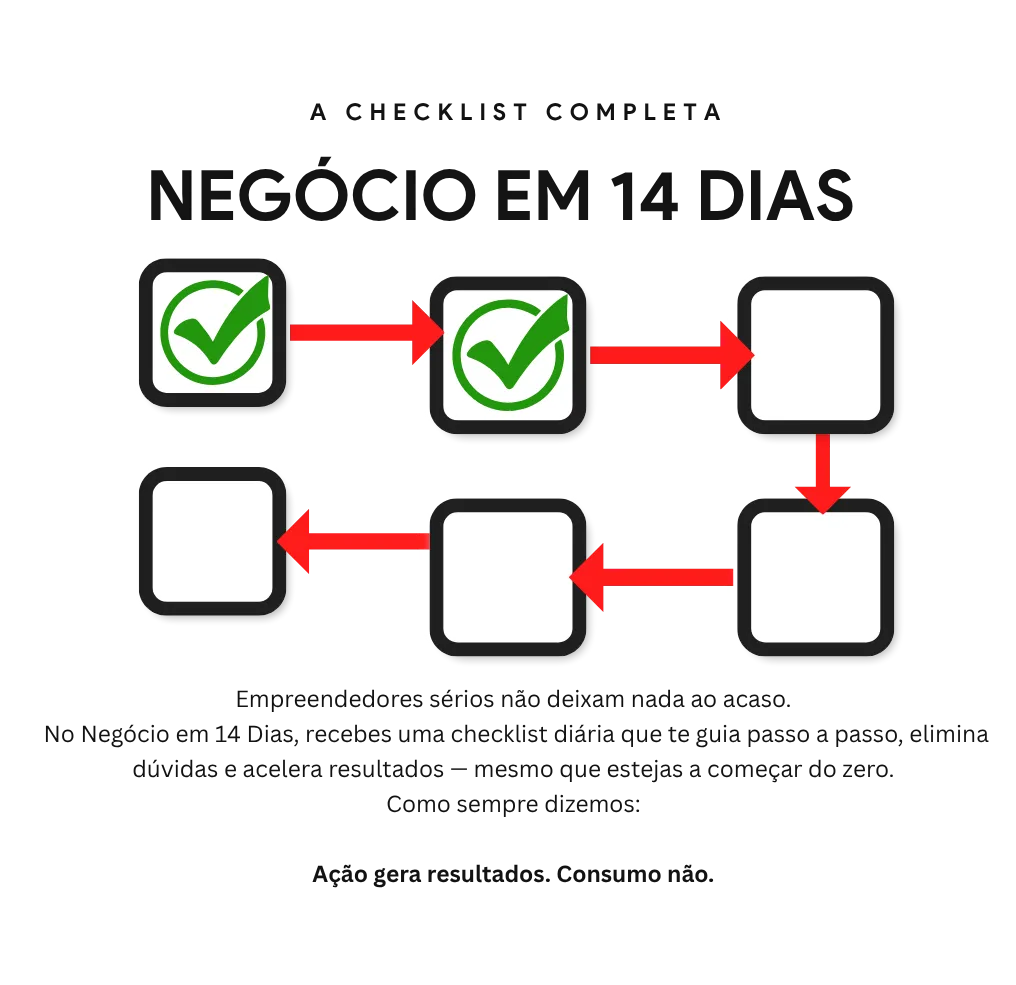 AVISO LEGAL: Os resultados mencionados nesta página, associados ao programa Negócio Online em 14 Dias referem-se aos nossos resultados pessoais e, em alguns casos, aos resultados de clientes anteriores. Estes exemplos servem apenas para fins ilustrativos. Não garantimos nem sugerimos que irás replicar estes números. A verdade é simples: a maioria das pessoas que consome conteúdos “como fazer” não toma ação consistente e, por isso, não obtém resultados. O teu desempenho dependerá sempre de fatores como o teu nível de dedicação, conhecimento, disciplina, capacidade de execução e condições de mercado. Criar um negócio real implica risco, trabalho sério e decisões estratégicas. Nenhum curso, incluindo este, substitui esforço, prática e responsabilidade pessoal. Se não estás disposto(a) a aplicar o que aprendes, implementar com consistência e assumir responsabilidade pelos teus resultados, por favor NÃO COMPRES o programa Negócio Online em 14 Dias
